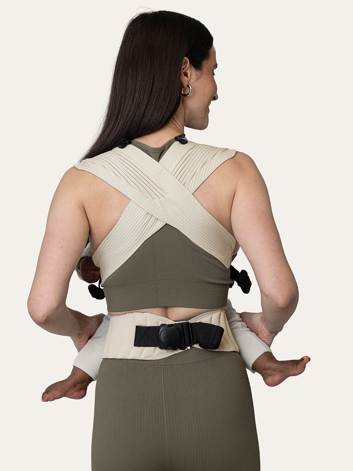 Der Mittelteil lässt sich mit dem Kordanzug stufenlos einstellen und an die Größe des Babys anpassen. Die Flybaby Babytrage unterstützt dadurch die Anhock-Spreiz-Haltung deines Babys – in jeder Größe.