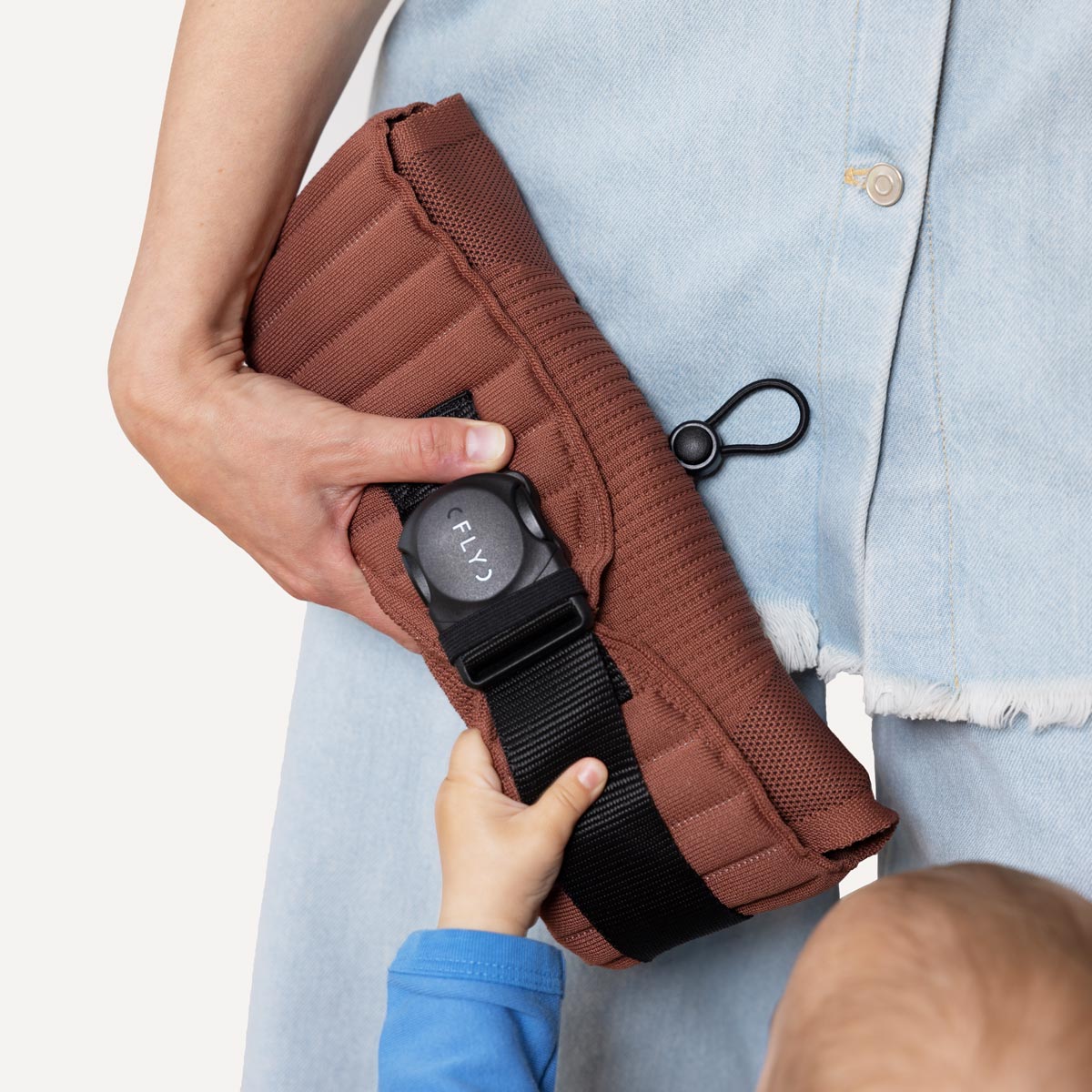 The nearly 425g lightweight and soft carrier also has a really small packed volume. Measuring 30×10×10cm, it goes everywhere with you and is conveniently and readily available on site when needed - perfect for on the go. If needed, you simply pack a Flybaby Bag for on the go.