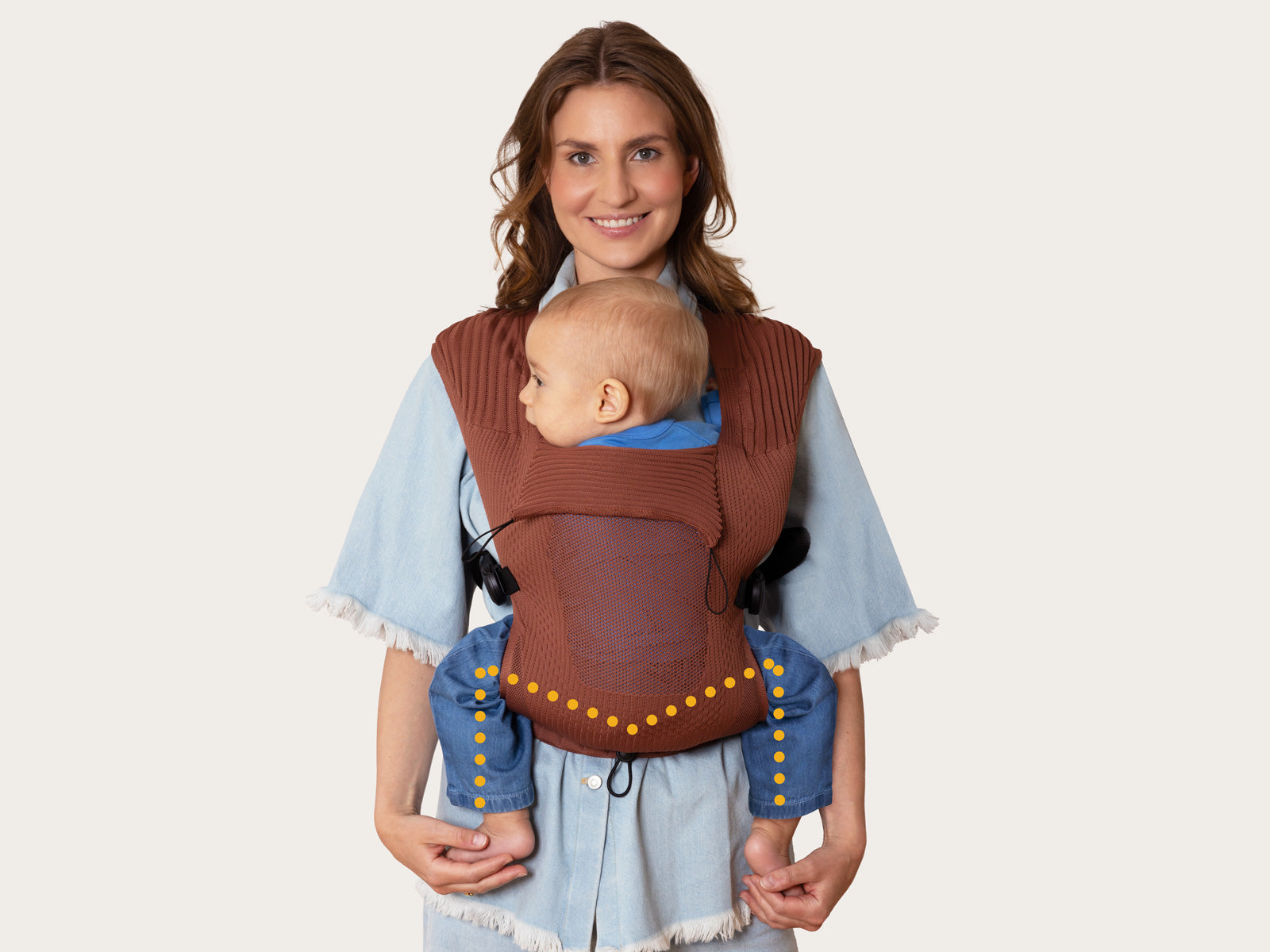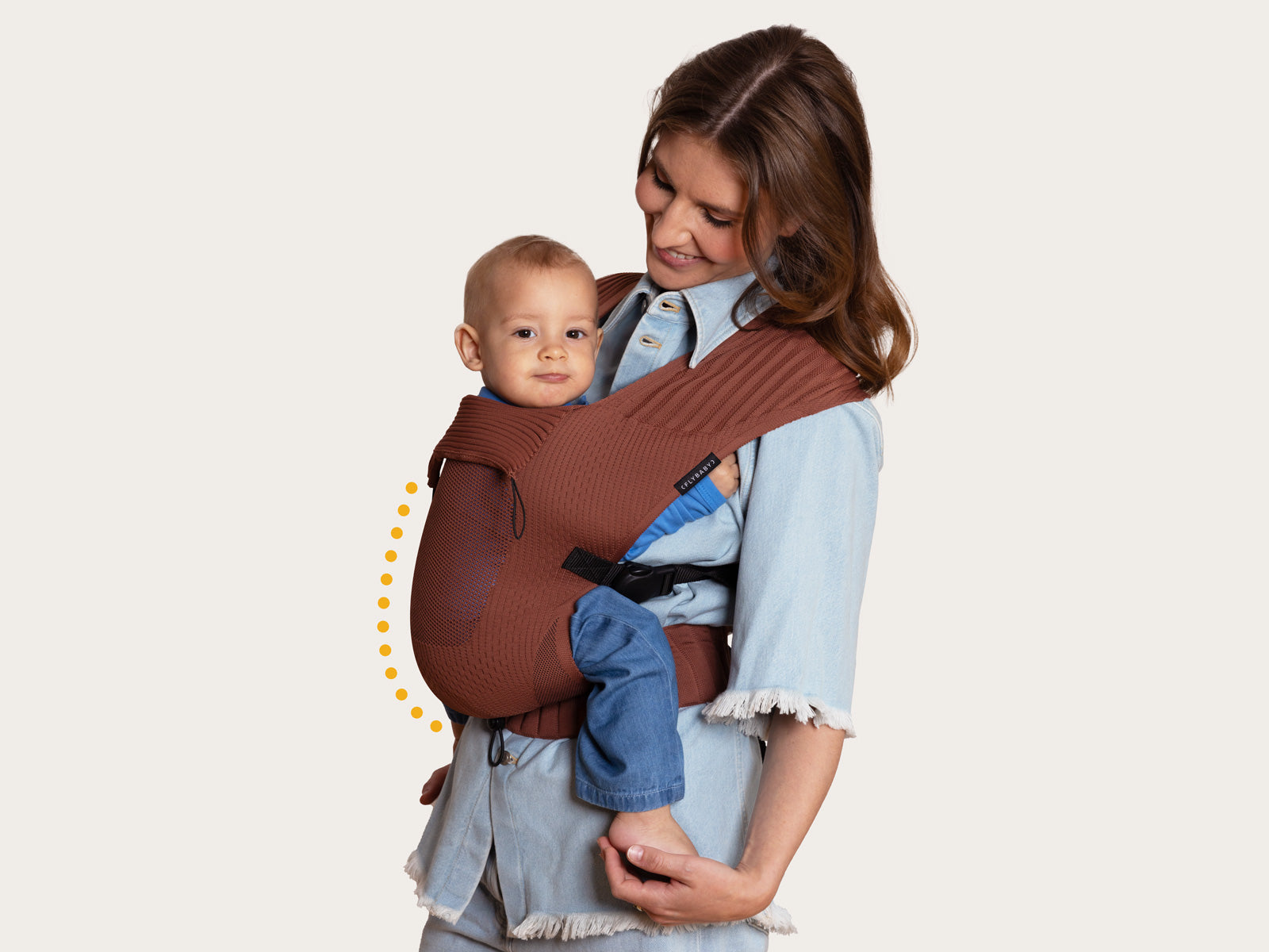De gehurkte spreidhouding bevordert de gezonde ontwikkeling van de wervelkolom en heupen. Het is de orthopedisch aanbevolen positie voor je draagbaby gedurende de hele draagtijd.